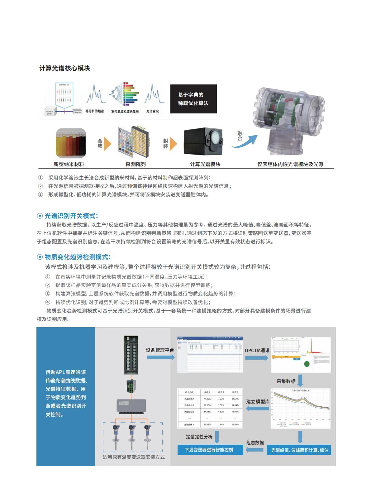 原位光譜檢測變送器,是一款以溫度變送器為主體結構、融合微型計算光譜的新型變送器, 是基于物質(zhì)熒光特性的擁有光譜檢測能力的創(chuàng)新型現(xiàn)場儀表,可在原先溫度測量點位基礎上額外感知光譜信息,具有體積小、成本低、響應快等特點。 在化工、制藥等領域, 可通過內(nèi)置激光光源的激發(fā), 實時獲取物質(zhì)熒光光譜數(shù)據(jù), 并結合配套工具軟件,將光譜信號中所蘊含的信息上送至控制系統(tǒng)及診斷系統(tǒng)。 幫助用戶深入理解生產(chǎn)反應過程、優(yōu)化工藝參數(shù)、提升產(chǎn)品質(zhì)量,最終實現(xiàn)高效、安全、穩(wěn)定的生產(chǎn)。原位光譜檢測變送器支持光譜識別開關、 物質(zhì)變化趨勢檢測兩種模式, 支持RS485、APL兩種通訊方式,并結合上層管理軟件,實現(xiàn)光譜數(shù)據(jù)獲取、關鍵譜點信息標注、 識別策略注入、 成分識別算法學習及構建等。